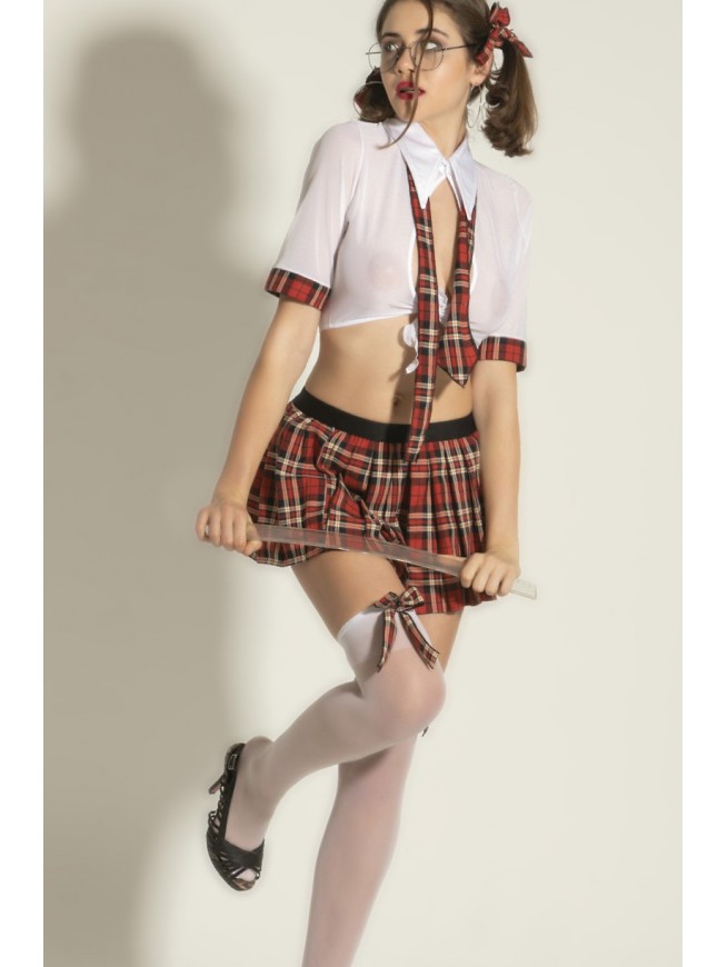 Kırmızı ekose desenli pliseli mini etek, transparan bağlamalı beyaz gömlek, uyumlu kravat ve dantel kurdele detaylı beyaz dizüstü çoraplarla bu set, hayal gücünü zorlayan bir gecenin anahtarı. İnce detaylarla hazırlanan bu 5 parçalık set, hem eğlenceli hem de baştan çıkarıcı tarzıyla geceni unutulmaz kılacak.
