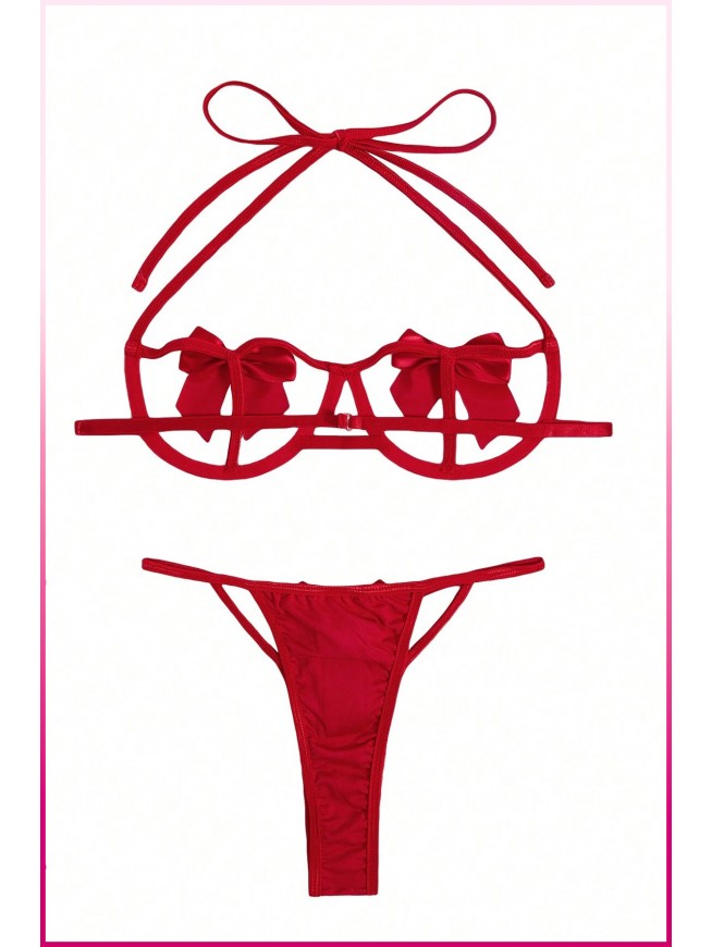 Kırmızı Göğüs Fiyonklu Balenli Sütyen Külot Takım
