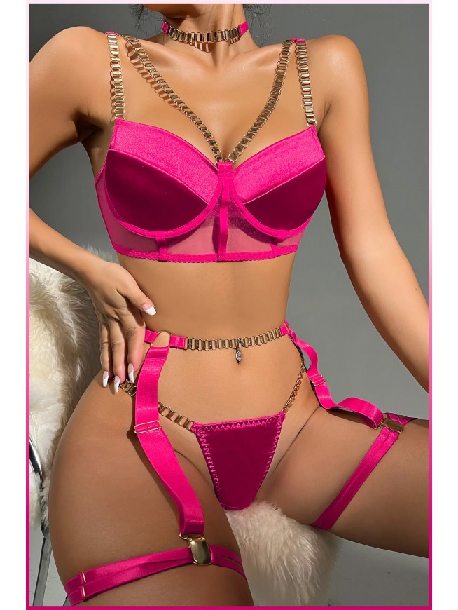 Fuşya Merdiven Zincirli Göğüs Balenli Kadın Seksi Jartiyer Takım