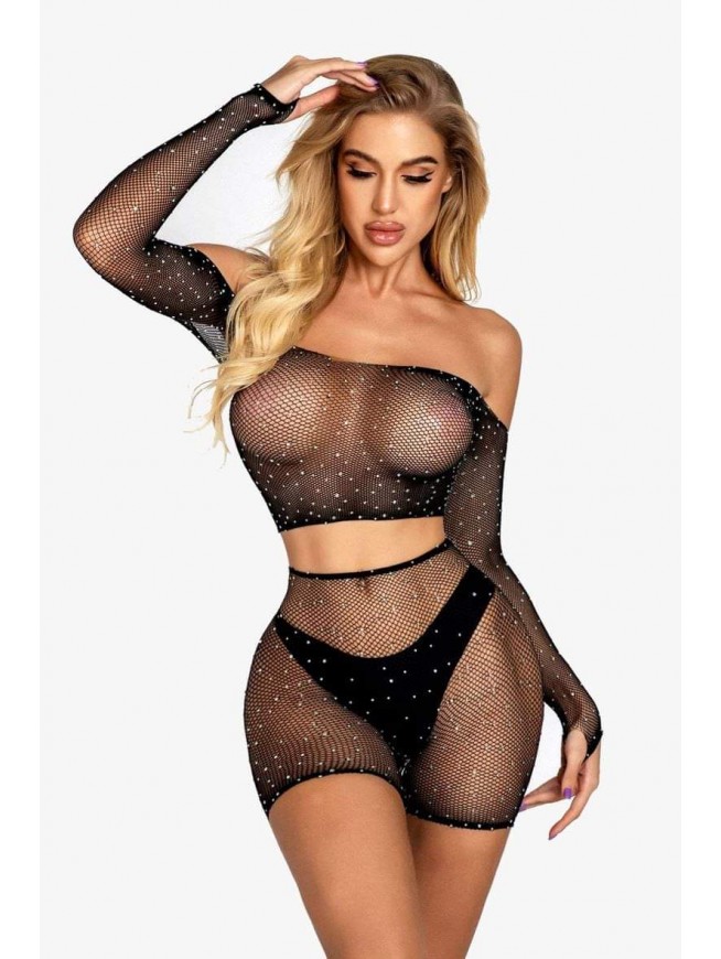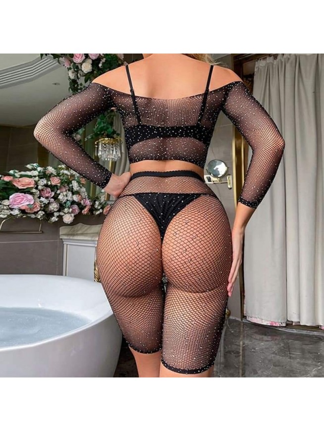 2 Parça Taşlı Omuzları Açık Crop- Şort Vücut Çorabı