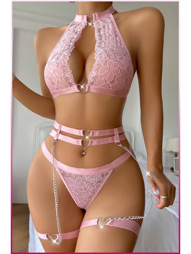 Pembe Dantelli Kalp Detaylı Zincirli Seksi İç Giyim Seti