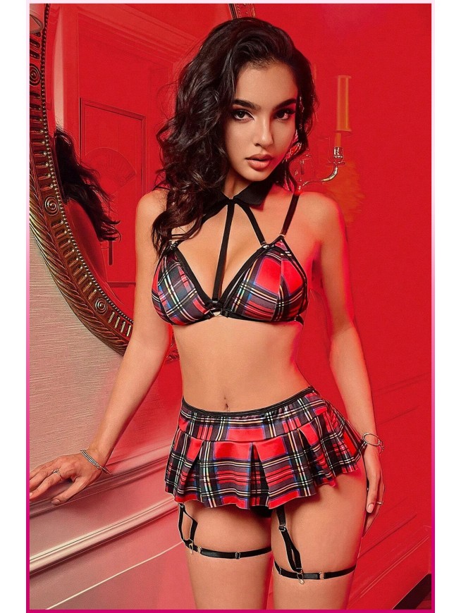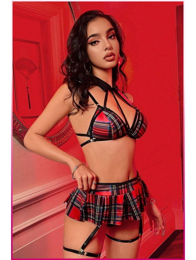 Kadın Kırmızı Ekose Etekli Liseli Seksi Kostüm