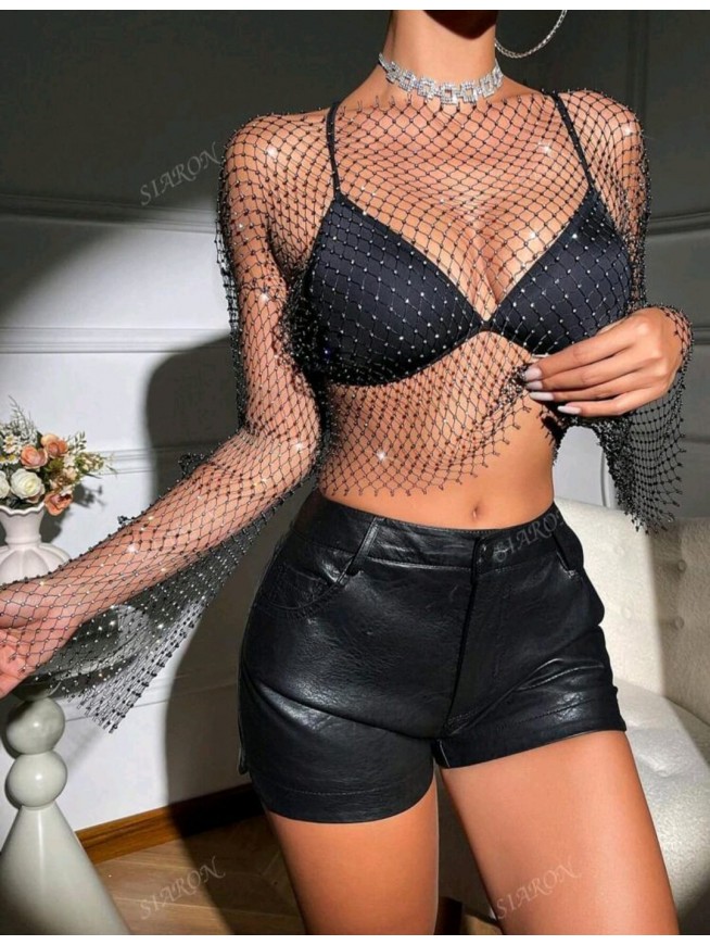Kadın Siyah Kristal Taşlı File Crop