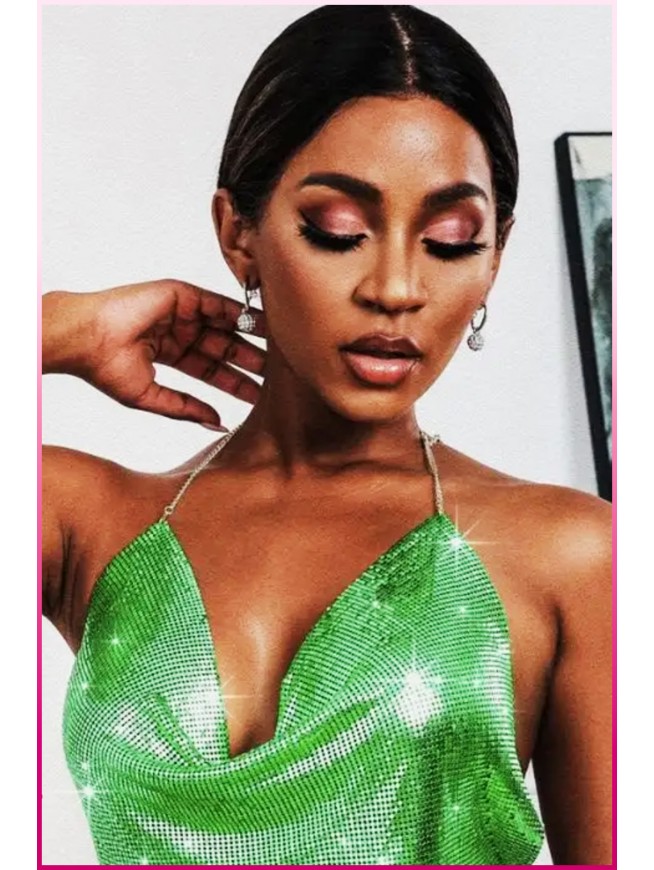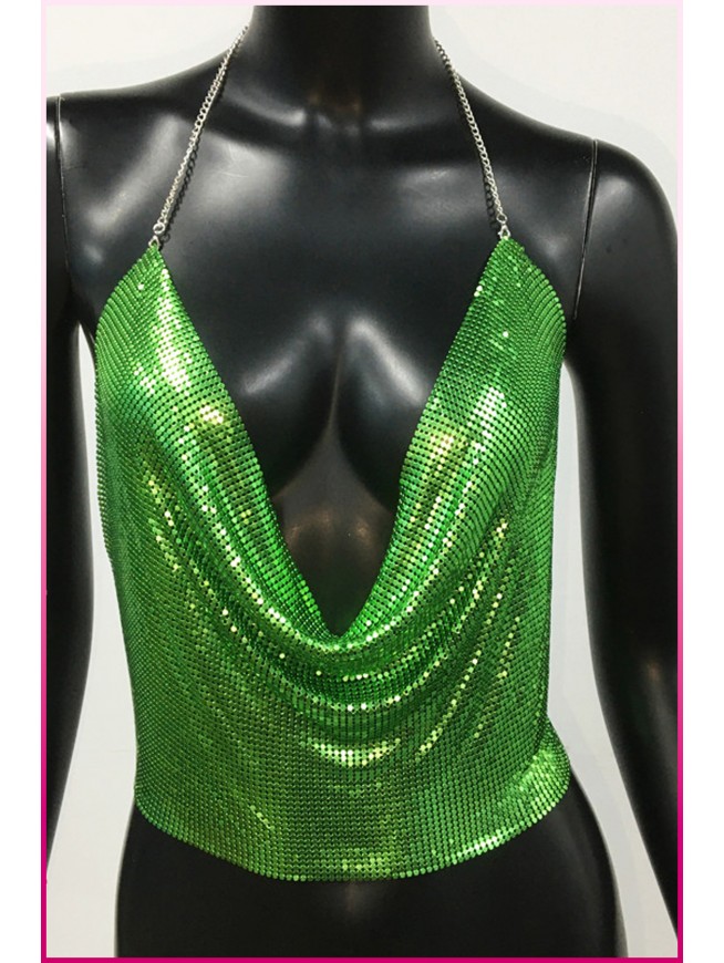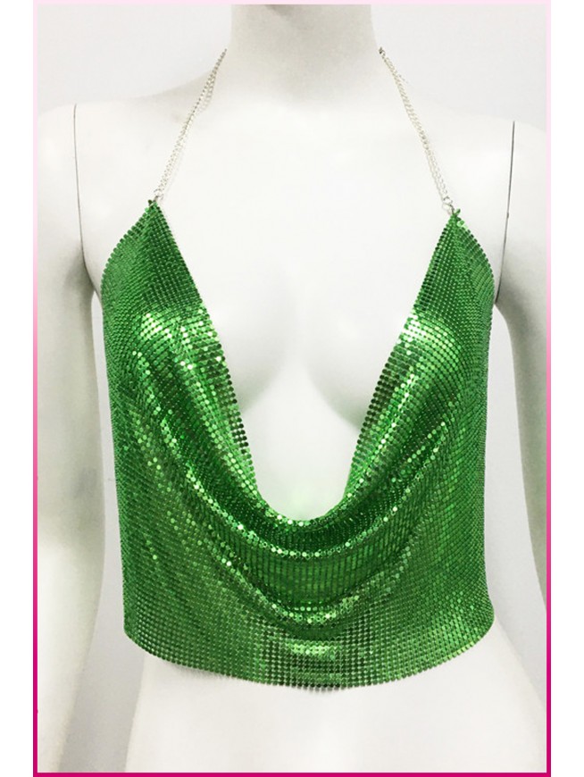 Kristal Yeşil Taşlı Parlak Crop & Bluz Kolsuz Kayık Yaka Parti Plaj Büstiyer