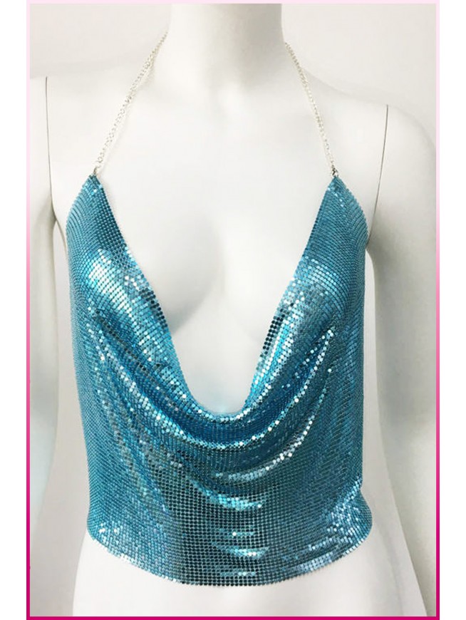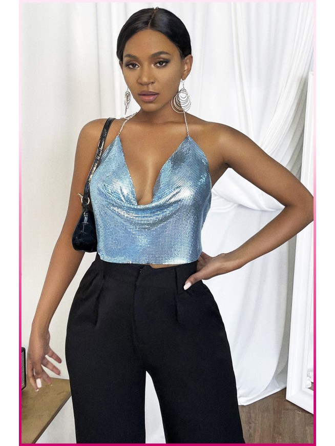 Kristal Mavi Taşlı Parlak Crop & Bluz Kolsuz Kayık Yaka Parti Plaj Büstiyer