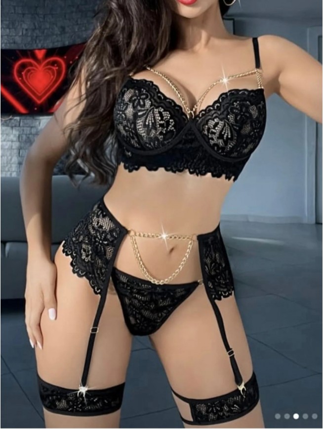 Kadın Seksi Siyah Jartiyer – Dantel ve Zincir Detaylı Sütyen Külot Takımı